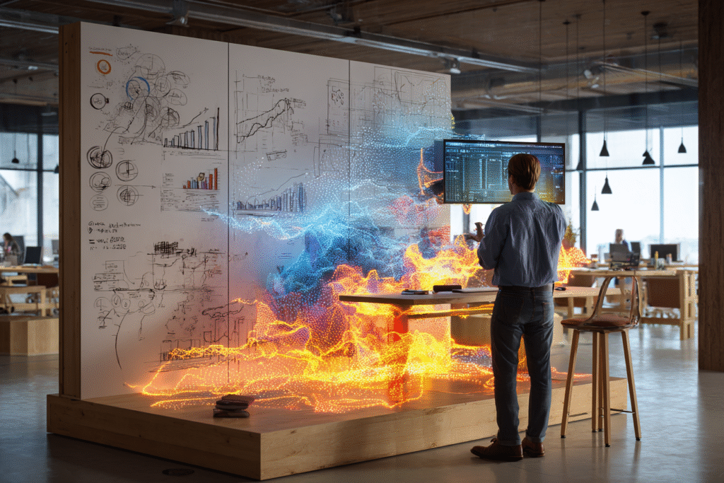 The conference room holds twelve people and thirty-seven AI agents. The humans are visible, seated around the polished table, coffee cups steaming. The agents exist as active processes, analyzing data streams, generating reports, monitoring market conditions. The team lead doesn’t manage them differently because of what they are, but because of how they think.